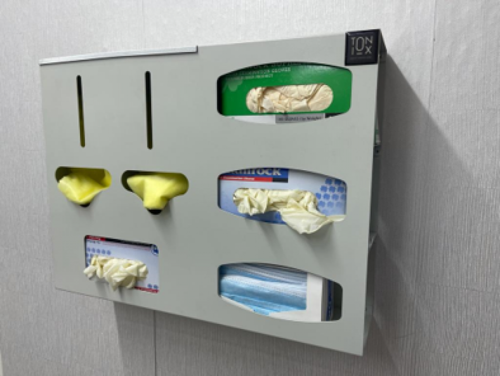 - 6 compartments for gloves, face masks, head & shoe covers, disinfectant and gowns